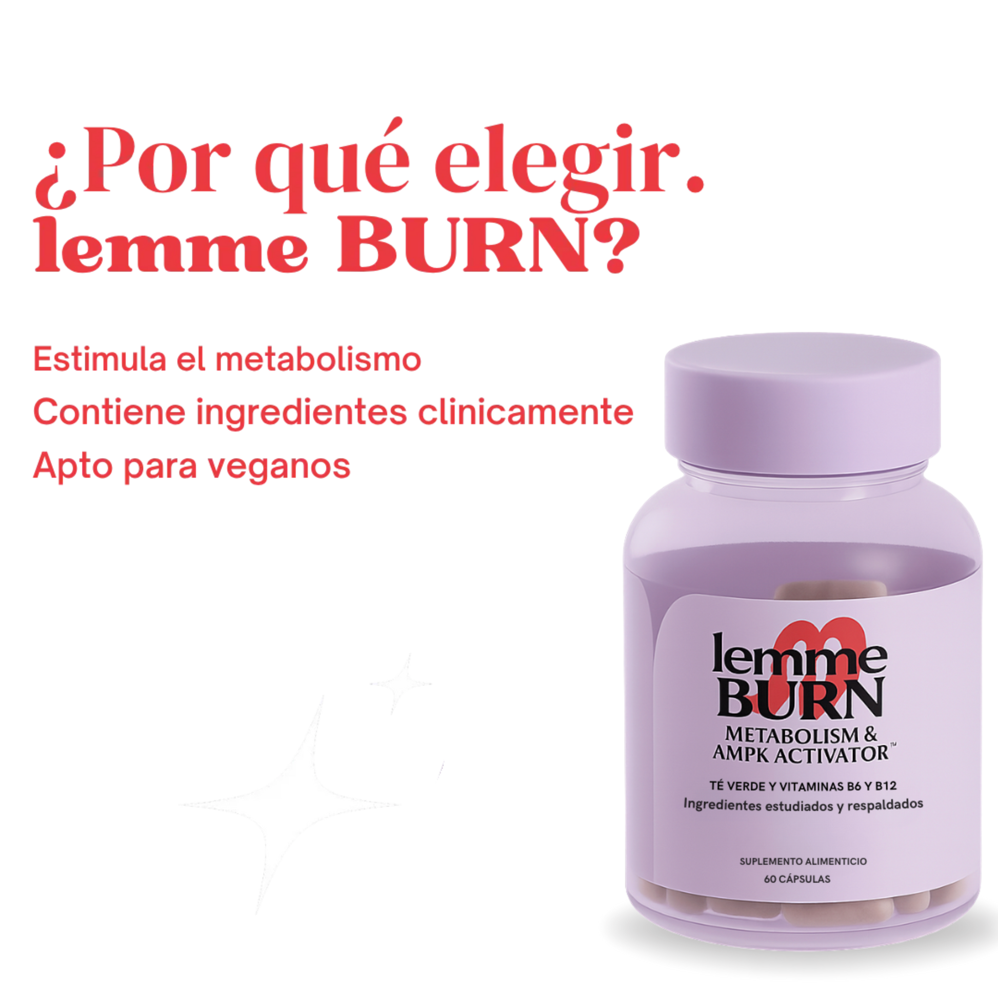 AMPK es una enzima que detecta el nivel de energía celular y ayuda a mantener el equilibrio energético. Esta función es clave para el metabolismo y la regulación de la saciedad. Con la edad, la actividad de AMPK disminuye, lo que provoca una regulación metabólica deficiente, un aumento del estrés oxidativo y una menor capacidad de "autolimpieza" celular (pérdida de grasa). Lemme Burn Activa tu AMPK, lo cual ayuda a acelerar el metabolismo y que vuelvas a quemar más grasa.