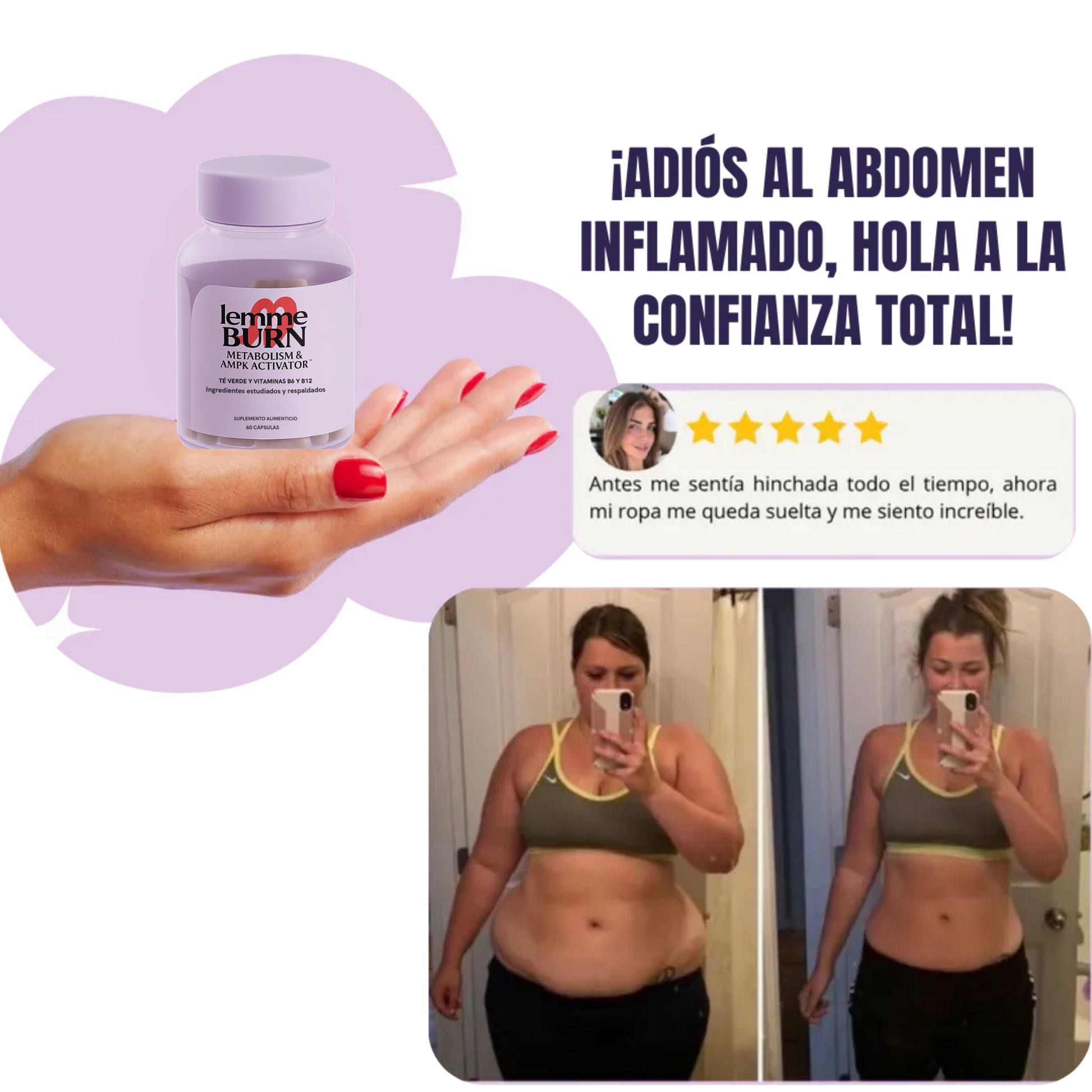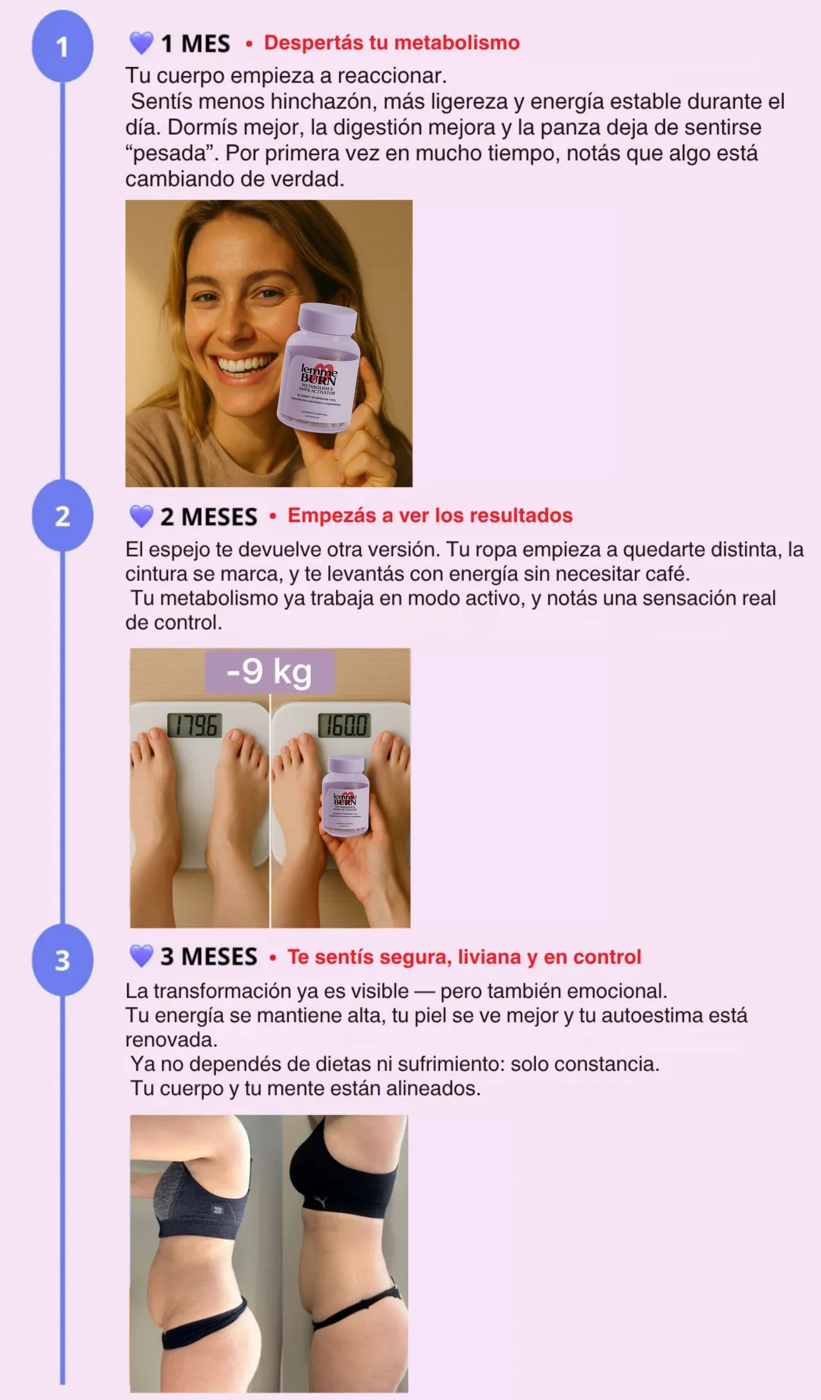 “Siempre me costó HORRORES bajar, sobre todo después de los 40. Con Lemme Burn, comiendo un poco mejor y caminatas, en 2 meses bajé 12 kg. Lo que más me sorprendió fue la cintura, la tengo mucho más marcada y la hinchazón es cada vez menor. Voy a seguir comprando”