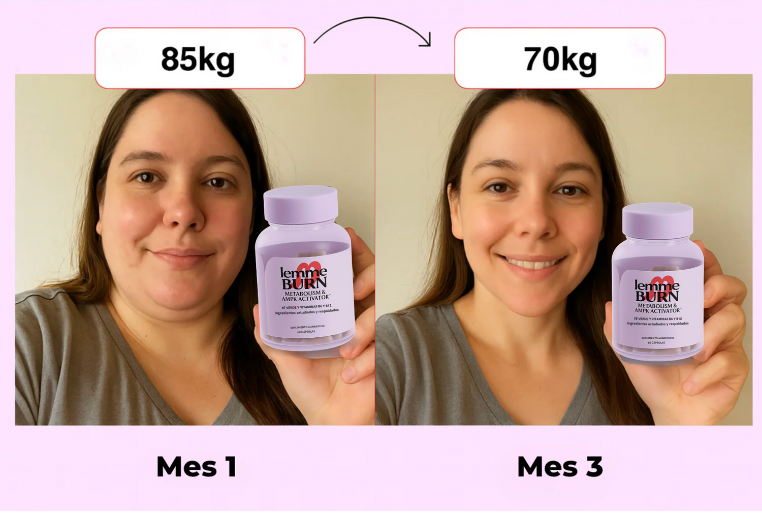 “Entre trabajo y facultad estaba hecha bolsa, comía mal y no veía resultados. Empecé con Lemme Burn, acomodé un poco las comidas y en 2 meses bajé 7 kilos. La diferencia en las fotos de antes y después es tremenda, sobre todo en panza y cara.”